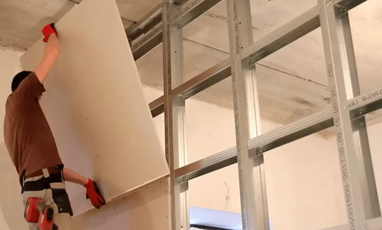 Первым этапом является монтаж металлического каркаса. Затем происходит крепление гипсокартона к каркасу с помощью шурупов или клея. После этого необходимо зашпаклевать швы и отверстия, чтобы поверхность была гладкой.